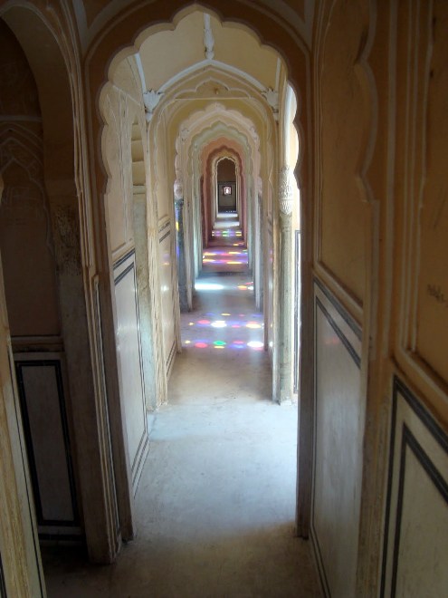 One of the highlights of the Hawa Mahal are the small windows or Jharokha’s that decorate the insides of the Palace with vivid colors. Since Marwari women observed the purdah or veil system, they were usually confined inside the walls of the palace, peeking out through these windows to witness the life outside. On the inside the windows are laced with colored glass panes, which create pretty patterns when the sun’s rays fall inside the room through the windows.