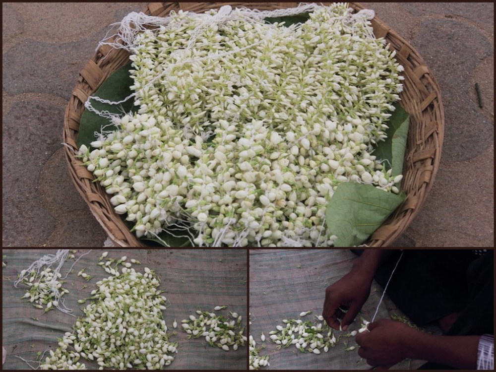 Mogra, popularly known as Jasminum sambac a variant of the jasmine flower native to South and Southeast Asia is usually knotted in a sting and usually worn by women on their hair. It is a symbol of a woman who is happily married. Usually widowed or divorced women wearing flowers on their hair is frowned down upon. (Not so much in modern India though, the practice is still quite rampant in the rural regions of the country.) In this collage, you can see separated and cleaned heaps of picked flowers, the process in which they get weaved, and the finished product. Hope you enjoy the pictures!