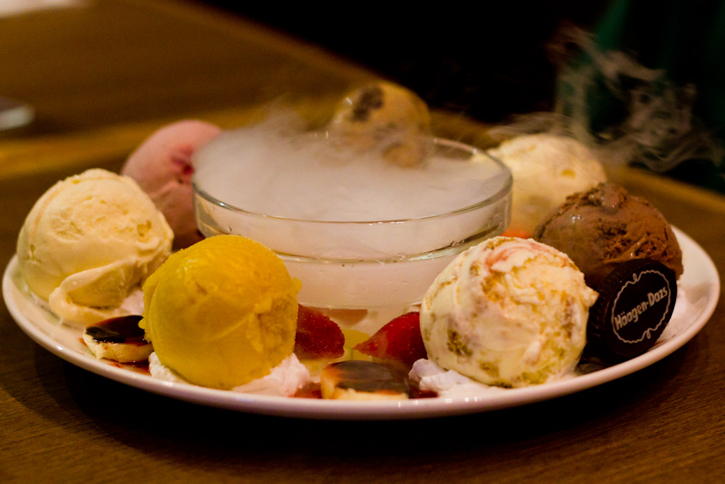 This is ice cream lover’s heaven! Seven sins, all in one plate with simmering dry ice adding to add a dramatic effect. And then there are berries, bananas and cream to make the experience wholesome. Well, looks like German ice cream makers sure know how to present the old school ice cream scoops in a spectacular manner!