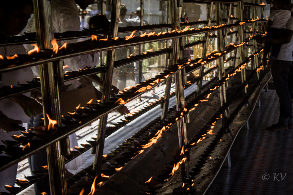 The Sacred Tooth Relic temple in Kandy, Sri Lanka is said to house a tooth of the Buddha. During puja, the heavily guarded sanatorium holding the stupa containing the tooth is open to devotees and tourists. The tooth is held inside a gold casket shaped stupa, which is, in turn, nested inside a set of six stupas.