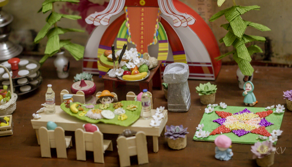Over 10 days of the Onam celebrations, you can enjoy Vallam Kali (boat races), Pulikali (tiger dances), Pookkalam (flower Rangoli), Kali, Tug of War, Kaikottakali (women’s dance), Kathakali (mask dance), and Atthachamayam (folk songs and dance), among other celebrations across Kerala. The highlight of Onam though is the sadya. Everything that is harvested during the season is offered on a plantain leaf-plate. The miniature sadya in the pictures is courtesy Shilpa of suenosouvenir! You can see the puokkalam and the coconut leaf toranam too. Too bad I couldn’t get the traditional lamp, a miniature of which is nested away back home. Happy Onam everyone!
