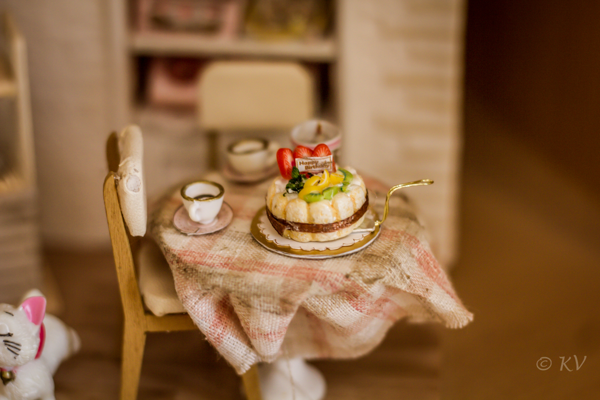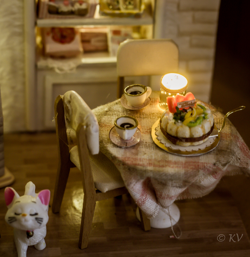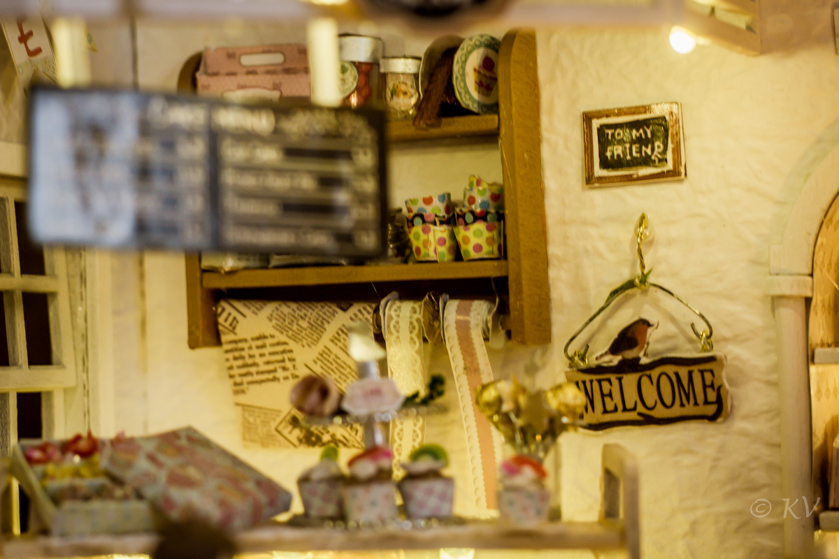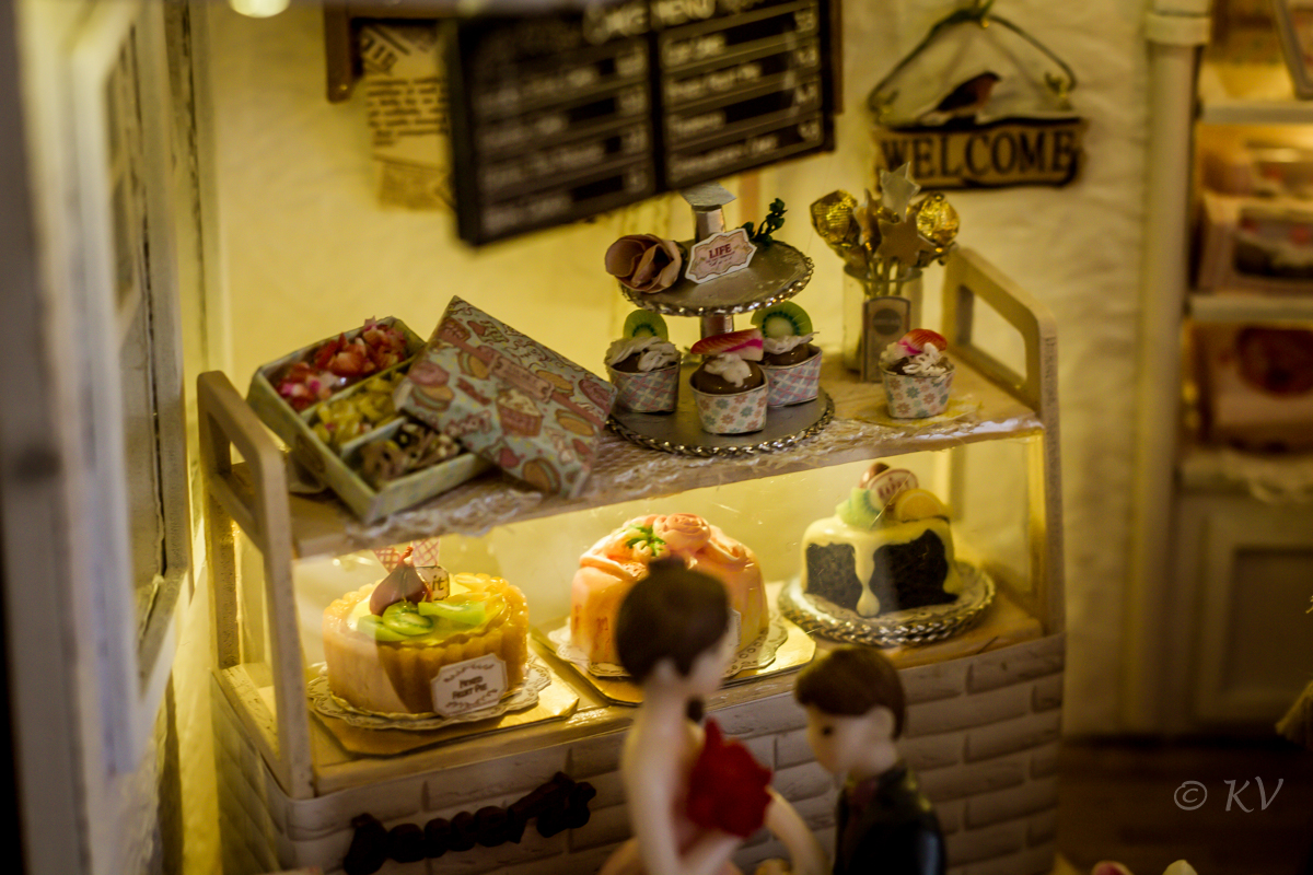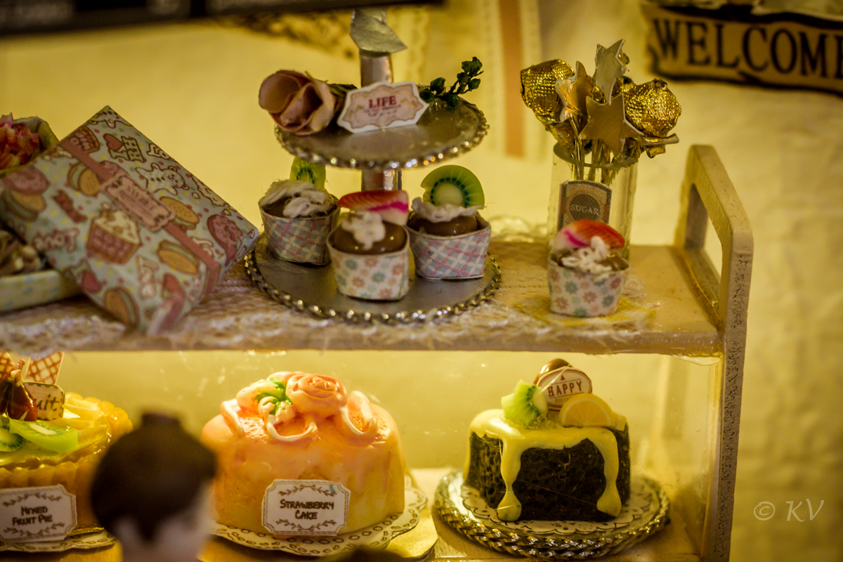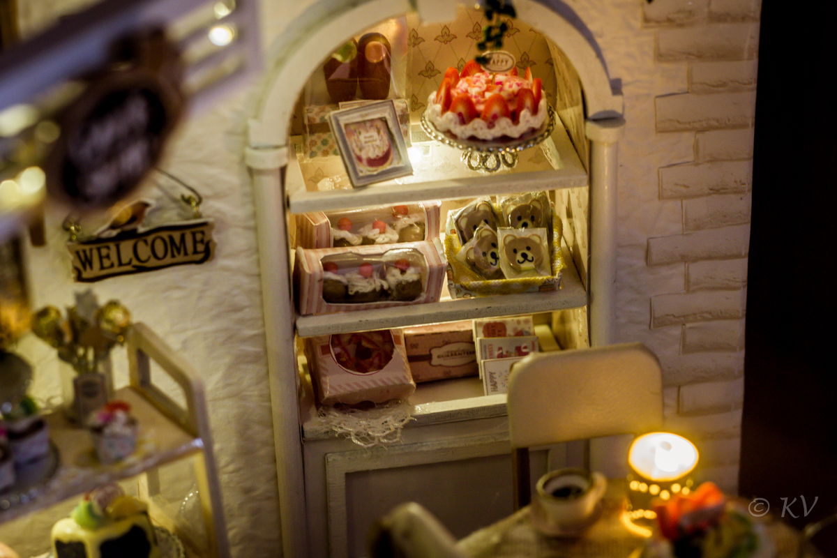 I’m not a sweet-toothed person, but a sweet shop is a visual delight. The way a sweet meat or cake shop is set up, it is just built to entice you to buy something. The beautiful cakes, cup cakes, muffins, donuts, eclairs, coffee and lollipops make your heart sing with joy. When I was putting this lovely cake shop DIY Kit together, a couple of tiny things make me smile: the gorgeous effect of the lighting, the pretty cupcake liners, the packaging boxes, the candle lit and the Rilakkuma Bear cakes!  Rilakkuma means “bear in relaxed mood” or “relaxed bear” in short (I googled that). The snooty kitty, who you’ll see in a few more posts is the icing on the cake. What is your favorite sweet craving?
