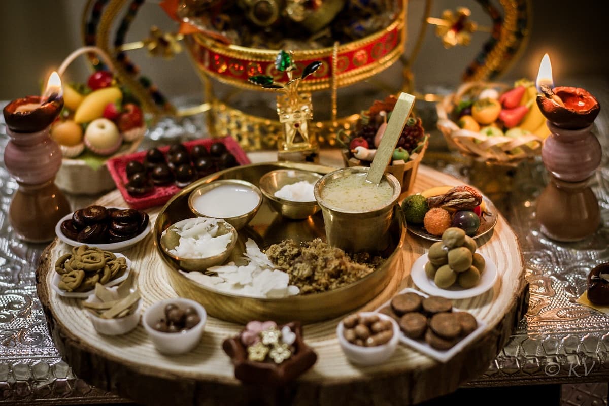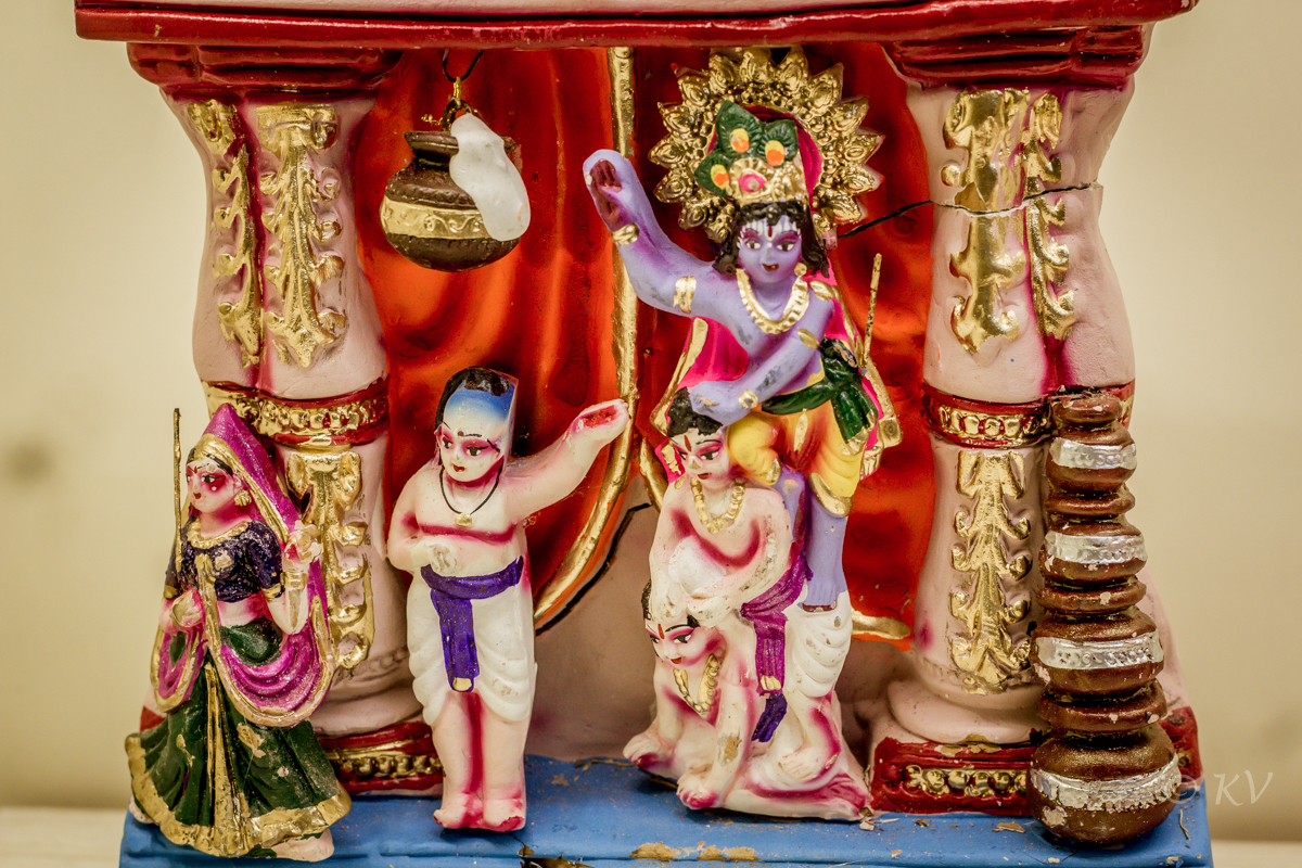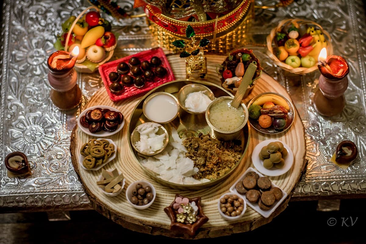 That brings us to Gokulashtami, or janmashtami. It marks the birth of Lord Krishna, the 8th incarnation of Lord Vishnu, the preserver and protector of the universe in Hindu Dharma. Krishna’s birth marks the beginning of Kalyuga or modern times. The celebrations are a grand affair, with a lavish spread for the beautiful god. Adopted to the Yadava clan, he is known as the protector of cattle. The spread has all sort of milk products, milk, butter, curd, beaten rice, jaggery and roasted gram mix, murruku, vella seedai, uppu seedai, thattai, ribbon pakoda, neiappam and laddoo. the spread also has an assortment of fruits, berries, coconut and flowers. At the stroke of midnight, the lord is born, fed and the craddle is rocked.