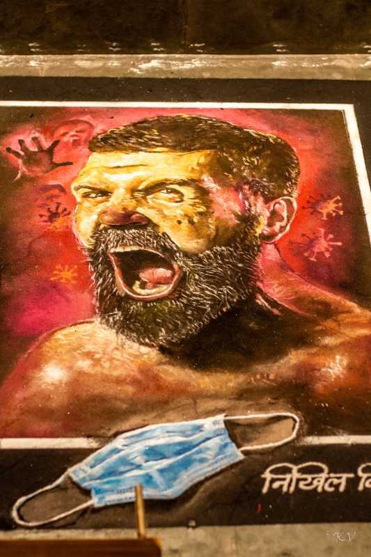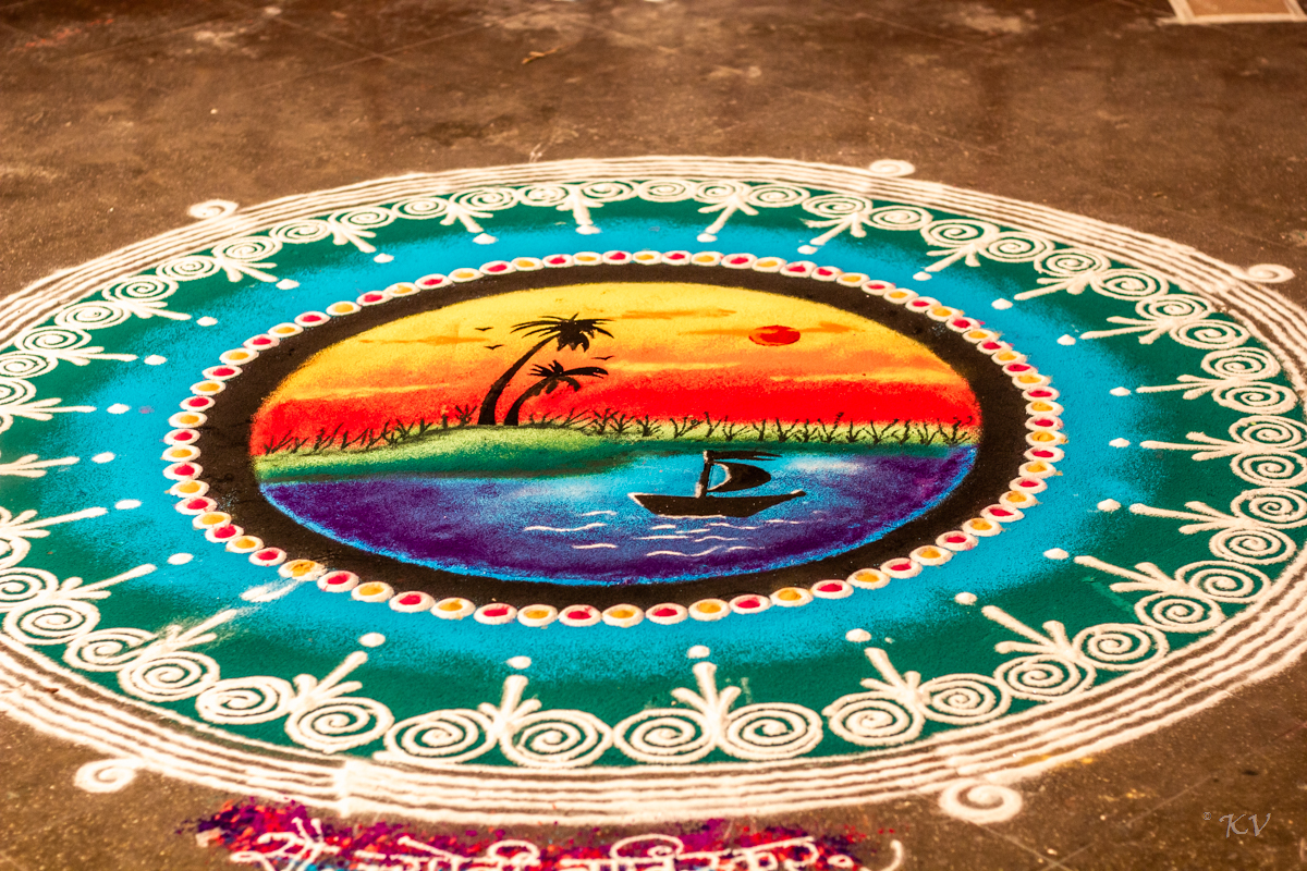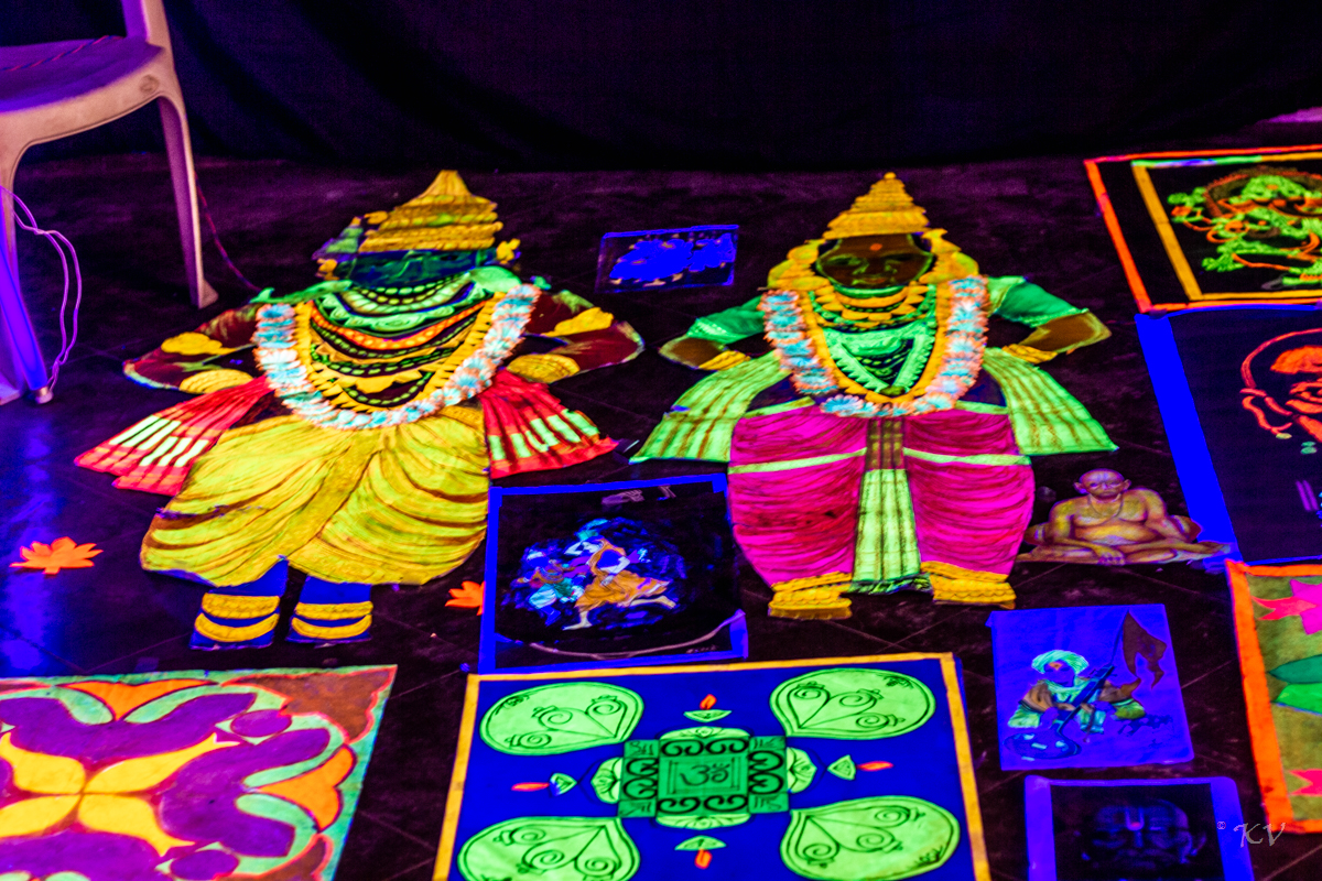 This phenomenon was a Diwali tradition for us growing up, which abruptly stopped a few years ago. We still wonder with amazement that these are created with sand on uneven floors and not a painting on a canvas. Getting the skin tones and textures right is such a wondrous task, Just notice the mask. That is made from sand too! They had to instruct volunteers to tell visitors not to pick up and trash it. Talk about realism! The pictures don’t do justice to what you do on your screen!